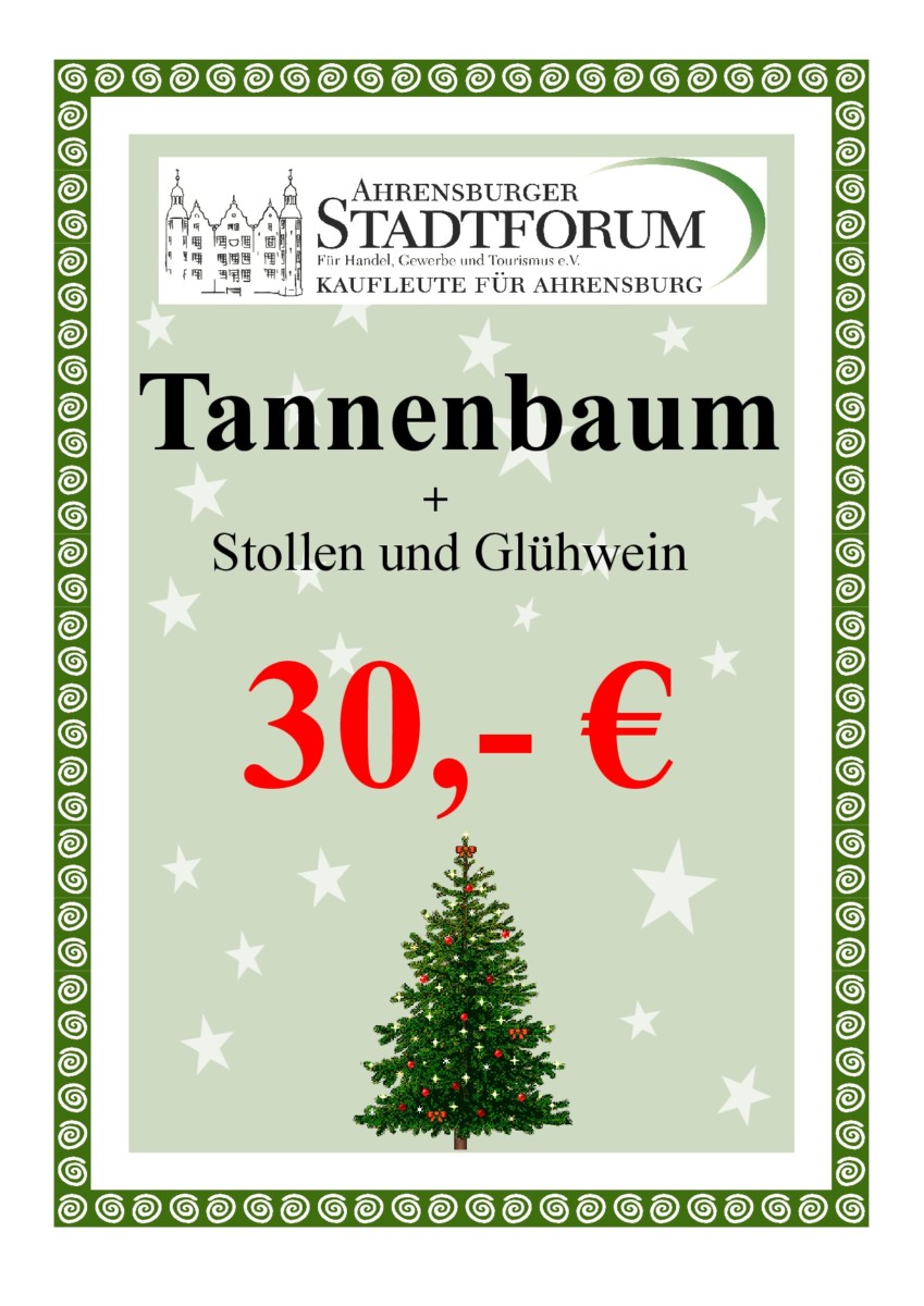 Für viele Ahrensburger Familien ist es schon Tradition: den Tannenbaum kauft man am letzten Samstag vor Weihnachten – 21. Dezember ab 9 Uhr – auf dem Rondeel beim Stadtforum. Da trifft man Freunde und Kollegen, genießt den Glühwein (spendiert vom Stadtforum zu jedem gekauften Baum) und freut sich über den leckeren Stollen von der Stadtbäckerei Schacht (zu jedem Baum eine Scheibe gratis). Wir haben gut verhandelt und können in diesem Jahr unseren Preis senken. Jeder Baum kostet 30,- Euro, auch die ganz großen Bäume gibt es zu diesem Preis und bei Mini-Tannen kann mutig gehandelt werden.